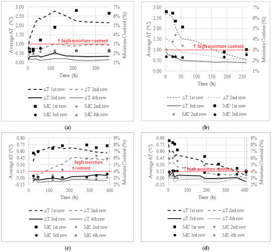 Average ∆T and moisture content (MC): (a) humidification—hot chamber; (b) drying—hot chamber; (c) humidification—cold chamber; (d) drying—cold chamber.
