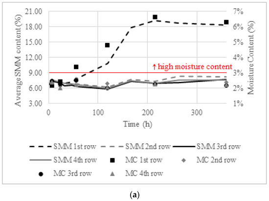 The variation of the SMM results and the MC at each row at each measurement time are shown in Figure 11, which was created following the same methodology used in Figure 10. Figure 11a makes it possible to point out that, in the humidification phase in the hot chamber, both the GM and the SMM indicated moisture only in the first row, although a good agreement was found between the SMM results and the MC.