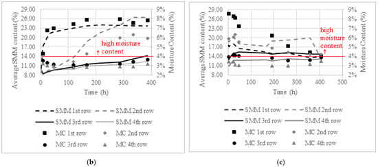 Average SMM results and moisture content (MC): (a) humidification—hot chamber; (b) humidification—cold chamber; (c) drying—cold chamber.