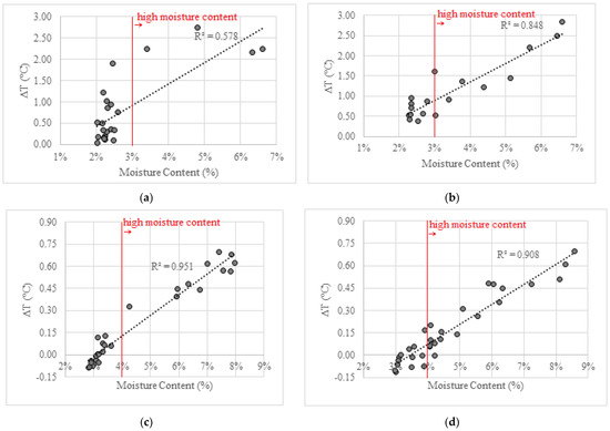 Figure 12 depicts the linear correlation between ∆T and moisture content, obtained by the GM, for all the tests performed. As shown in Figure 12a, during the humidification inside the hot chamber, high moisture content corresponds to ∆T higher than 2.0 °C. In this test, several measurements occurred in which a ∆T over 1 °C corresponded to a moisture content below 3%. All the measurements with a ∆T below 1 °C presented low moisture content, between 2.0% and 2.5%. For the drying process (Figure 12b), some differences can be noted, as most of the measurements with ∆T over 1 °C corresponded to high moisture content. Moreover, there is a higher linear correlation between the two parameters, as the determination coefficient is 0.85.
