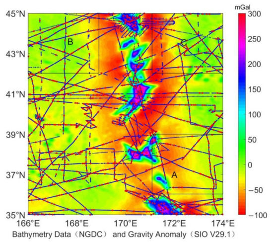 The bathymetry data used in this study are from the National Geophysical Data Center (NGDC), and the early single-beam bathymetry data have obvious measurement errors. Preliminary analysis found that the data may be obtained only a few hundred meters in the bathymetry data of several kilometers, so the error must be eliminated before use. The high-precision GEBCO sounding data are used as a constraint, and 2% of them are used as the detection limit of gross errors. Then, the moving window is used with 10′ × 10′ as the window size, that the moving step length size is 5′, and the error is eliminated by introducing the moving window with three times of the mean square error. A total of 27,717 ship measuring points were obtained, and the inversion considered the edge effect to intercept 1° outward. A total of 18,323 ship measuring points were selected and divided into control points and check points on average. The cyan is the control point, and the red is the check point (Figure 1). Three different subsets were selected in this area, and the number of data points is shown in Table 1. The gravity anomaly data adopts the SIO V29.1 version provided by Smith and Sandwell provided from the Scripps Institution of Oceanography, University of California San Diego, with a resolution of 1′ free gravity anomaly (Figure 1).