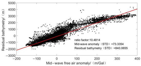 - The medium wave gravity anomaly and residual sea depth of the same ship survey control point are fitted by linear regression on the horizontal and vertical axes. The fitting result is the scale factor, as shown in Figure 2.