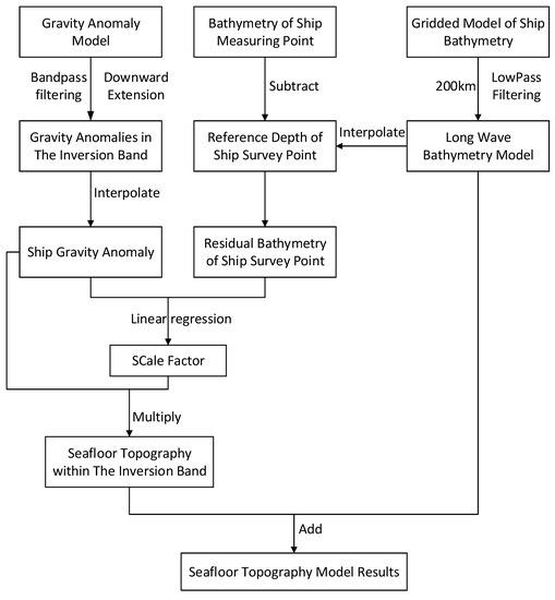 With the emergent development of satellite altimetry and gravimetry technology [8], it provides a new technical means to establish a global seafloor topography model. The seafloor topography based on satellite altimetry was inverted based on a linear relationship between the gravity anomaly and the seafloor topography. Smith and Sandwell (SAS) and gravity-geologic methods are the most classical. The Smith and Sandwell method was proposed by Smith and Sandwell based on the Parker formula [9] and Watts model [10], and the sea depth was determined based on the linear relationship between the gravity anomaly and the sounding within a certain wavelength. The gravity-geologic method (GGM) was originally used to measure the height of the bedrock under the sediment, which can be used in topography inversion since the internal density of seawater does not change with depth. The gravitational geological method has a fast calculation speed and the seafloor topography can be inverted by using bathymetry data and gravity anomaly for large ocean areas via determining the density difference of the crust.
