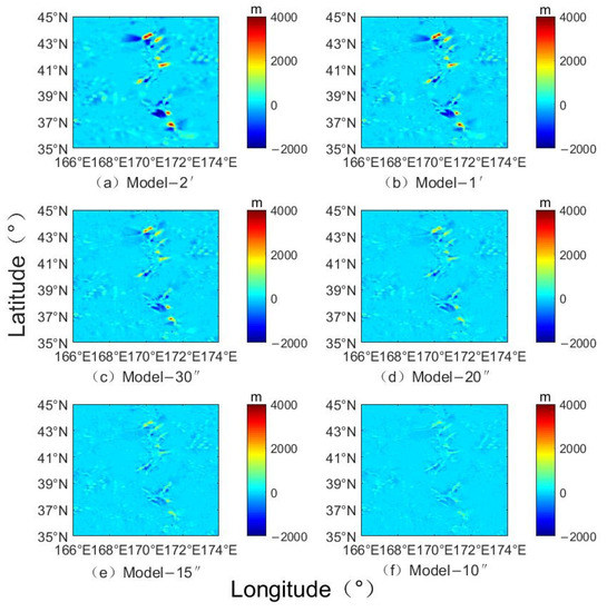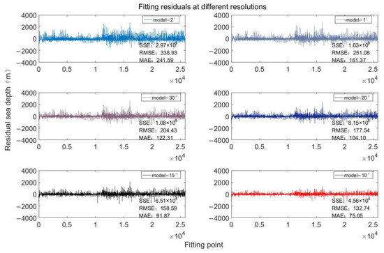 Using gravity anomalies and ship survey data [25], through the above inversion process, the seafloor topographic models with different resolutions in the Southern Ocean region of the Pacific Emperor Seamount chain were obtained by changing the resolution size and data processing under the grid settings at different resolutions [26,27,28,29]. The corresponding inversion models are named Model-2′, Model-1′, Model-30″, Model-20″, Model-15″ and Model-10″, respectively. Figure 4 shows the distribution of fitting residuals at different resolutions. With the increasing resolution, the fitting residuals of ship survey points are significantly different, and Model-10″ residual distribution is significantly better than Model-2′, whose residuals are significantly reduced. According to the information provided by the residuals, the rationality of the analysis method and the reliability of the data. Among them, the sum of squares of error (SSE) represents the effect of random errors, the root mean square error (RMSE) represents the deviation between the observed value and the true value, and the mean absolute error (MAE) can better reflect the actual situation of the predicted value error. The sum of squares of the residuals decreases from 2.97 × 109 m to 4.56 × 108 m as the resolution increases from Model-2′ to Model-10″. In addition, RMSE and MAE decreased from 338.93 m and 241.59 m to 132.74 m and 75.05 m, with a decrease of 60.8% and 68.9%, respectively. The above analysis shows that the increasing the resolution of the inverted terrain can significantly reduce the impact of fitting errors, which improves the precision of the inversion model.