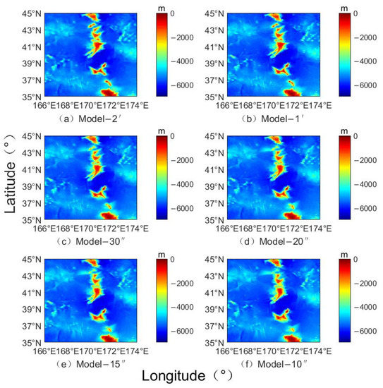 Figure 5 shows the seafloor topography inversion models of the Emperor Seamount Chain Southern Ocean Region with different resolutions. The inversion topographies in different resolution inversion models are not significantly different, but have some differences of subtleties in certain terrain areas, such as seamounts, valleys, and rolling areas. The well-known, high-precision terrain models, such as ETOPO1, S&S V19.1, and GEBCO-2020, are compared with our estimated terrain model for accuracy analysis. Table 2 shows statistical analysis on the data of different seafloor topography models. The results show no significant difference between the maximum and minimum values of the inverted terrain models with different resolutions and various terrain models. The standard deviation is used to evaluate the accuracy of the data with the improvement of the inversion resolution, whose standard deviation (STD) of the terrain data is gradually decreased from 925.22 m of the original Model-2′ to 898.24 m of the Model-10″. At the same time, the precision of terrain inversion with different resolutions is higher than that of the ETOPO1 model. With the improvement of resolution, its precision gradually becomes comparable to the high-precision terrain model. For example, Model-15″ and Model-20″ have the same precision as SRTM 30, S&S V19.1, and GEBCO-2020, and Model-10″ has a slightly higher precision.