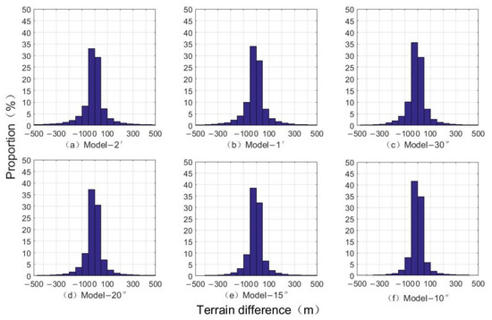 Figure 6 shows the comparison of inverted terrain data with different resolutions and bathymetric grid terrain models. According to the seafloor topography difference map, as the resolution increases the difference is gradually decreased, and the inversion effect is better. Table 4 shows the statistical differences between terrains with different resolutions and the NGDC grid model. It can be seen that the change of the resolution will affect the accuracy of the inverted terrain; the maximum and minimum of the difference and the average of the difference are inversely proportional to the change of the resolution. As the resolution increases, the difference in data is gradually decreased, and the precision is gradually improved. At the same time, as the resolution increased from Model-2′ to Model-10″, the standard deviation of the difference between the inverted terrain and the NGDC grid is decreased from 275.80 m to 87.93 m, with a decrease of 68.12%. The correlation of the inverted terrain is increased from 0.9545 to 0.9953, with an increase of 4.27%. Figure 7 shows the proportion distribution of the seafloor topography differences. The difference of the inversion topography is gradually decreased by the resolution increases, and the larger difference is optimized and reduced. The error ratio is gradually increased from 62.41% of Model-2′ to 76.45% of Model-10″ for the range of −50~50 m, and from 77.92% of Model-2′ to 90.20% of Model-10″ for the range of −100 to 100 m.