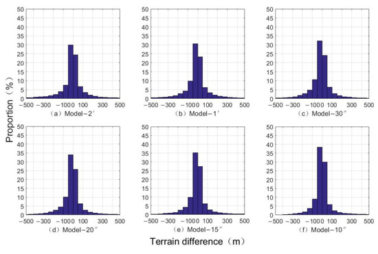 Table 5 shows the differences in check points. The error is the largest near the seamount, indicating that the complexity of the terrain has a greater impact on the accuracy of the seafloor terrain inversion. By changing the inversion terrain resolutions and comparing the interpolation checkpoint data extracted by the grid terrain models with different resolutions, the inversion precision is higher than the ETOPO1 model and the SRTM 30 model. With the increase in resolution, the precision is gradually equal to that of the S&S V19.1 model. The standard deviation of the difference is decreased as the resolution increases, from 66.13 m of Model-2′ to 43.74 m of Model-el-10″, with an increase of 33.86%. The data is gradually optimized. Figure 8 shows the distribution of the topography difference ratio of the Emperor Seamount Chain and the error is gradually decreasing. The error ratio of −50 to 50 m is gradually increased from 54.43% of Model-2′ to 68.31% of Model-10″, which is an increase of 25.51%, and the error ratio of −100 to 100 m is increased from 68.44% of Model-2′ to 83.15% of Model-10″, with an increase of 21.49% over the original.
