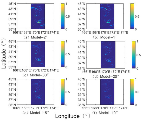 Figure 9 shows the relative error distribution of the Emperor Seamount Chain seafloor topography extracted from different resolution inversion topography models. It can be seen from the inversion seafloor terrain that the relative error near the seamount chain is relatively large. Because the valley terrain is flat and the terrain complexity is low, the relative error of the sea valley is lower than that of the seamount, and the inversion data has high accuracy. As the height of the seamount increases, the relative error of the seamount increases, and the complexity of the mountain terrain increases. The undulations will cause the inversion accuracy to gradually decrease, indicating that the complexity of the seafloor topography at different levels has different effects on the seafloor topography inversion. The comparison shows that as the resolution increases, the relative error is gradually decreasing by changing the resolution for inversion. The maximum relative error of Model-2′ is 1.09 and the average value is 0.04, which decrease to 0.74 and 0.01 of Model-10″, and its precision is increased by 32.11%. It shows that the terrain grid data of different resolutions have different effects on the precision of terrain inversion. The higher the resolution is, the higher the inversion effect is and the higher the accuracy is.