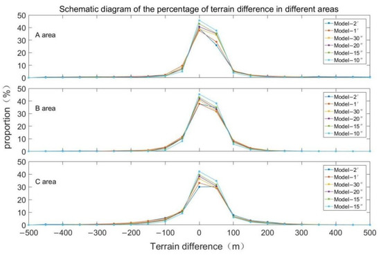 Figure 10 shows the topographic difference distribution between the inverted topography and the NGDC grid at different resolutions in different density distribution regions. It can be seen that the distribution of terrain difference is mainly concentrated in the range of −100 m–100 m. With the improvement of resolution, the terrain difference changes within this range. The terrain difference in area A is decreased significantly. The topographic difference ratio of −50 m–50 m is gradually increased from 65.30% of Model-2′ to 83.44% of Model-10″, with an increase of 27.78%. The terrain difference ratio of −100 m–100 m is gradually increased from 78.19% of Model-2′ to 92.30% of Model-10″, with an increase of 18.05%. In area B and area C, the proportion of terrain difference between −50 m and 50 m is increased gradually from 72.43% and 60.16% of Model-2′ to 83.54% and 76.80% of Model-10″, with an increase of 15.34% and 27.66%. The terrain difference ratio of −100 m–100 m is gradually increased from 90.80% and 78.20% of Model-2′ to 97.38% and 91.84% of Model-10″, with an increase of 7.25% and 19.43%.