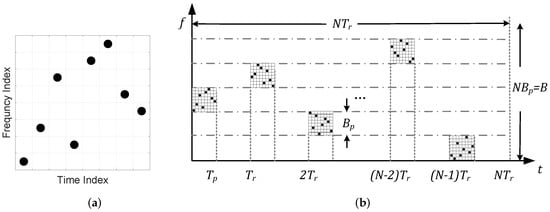 is the frequency of each sub-pulse based on the Costas array, and the Costas array of each pulse is different in this waveform. The Costas array is a special permutation matrix. The permutation matrix is a n-order square matrix with exactly one 1 per row and colunm, and the remaining elements are 0. As shown in Figure 1a, the box with a dot indicates element 1, and the blank box represents element 0. The key feather of the Costas array is that all the vectors between any two dots are distinct. It means the new matrix generated by translation along the horizontal and vertical axis will produce only one coincidence at most with the original matrix [25]. When the rows and columns are applied as the indices of the sub-pulse time and frequency, respectively, this feather brings nearly ideal ambiguity function characteristics to the Costas-DFC signal. The signal after the match filter will have a high compression value with low sidelobes. RSF-DC-DFC modulates different Costas-DFC waveform with random frequency. The time-frequency (TF) characteristics of the RSF-DC-DFC signal is shown in Figure 1b.