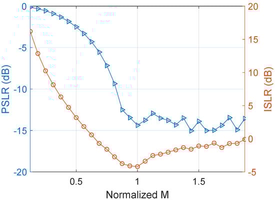 The order selection has to be made before the Costas array selection. The time-bandwidth product of the pulse is known as . Figure 2 exhibits the effect of the M value on the Costas DFC pulse compression performance under fixed pulse duration and bandwidth. Here, the peak sidelobe ratio (PSLR) and integrated sidelobe ratio (ISLR) is applied as the evaluation criteria, and M is normalized according to . PSLR declines gradually when the normalized M increases, and becomes stable after reaching 1. ISLR reaches a minimum value when the normalized M value is 1.