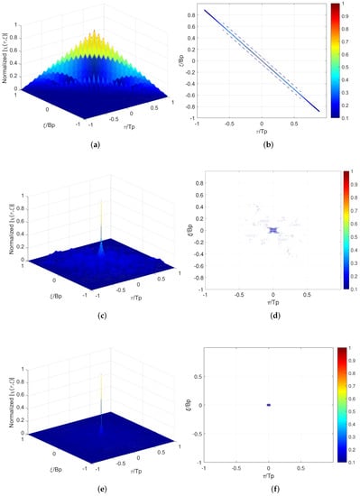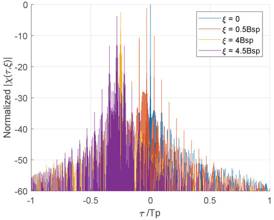 For a random stepped frequency modulated linear stepped-DFC waveform (RSF-LS-DFC), whose sub-pulses are stepped sequentially in each pulse, when the delay is an integer multiple of the sub-pulse width, that is , AF only contains the summation of . The multiple pairs of sub-pulses in the alignment part have a fixed frequency difference of , which will lead to an accumulation of the AF side-lobes at , forming the oblique ridge as shown in Figure 4a. For the non-integer time delays, the frequency coupling induced by the will increase the harmonics, which is reflected on both sides of the AF oblique ridge. This delay-Doppler coupling characteristic of RSF-LS-DFC is also reflected in the correlation function in Figure 5. On the Doppler profiles of integer multiples of , the correlation peak moves according to the range–Doppler coupling relationship, similar to the LFM waveform. On the non-integer profile, as the harmonics on both sides of the peak are greatly elevated, the range focusing performance is significantly deteriorated.