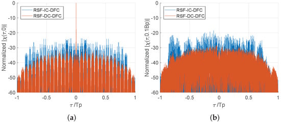Similar to the RSF-IC-DFC, due to the use of intra-pulse Costas modulation, the AF of RSF-DC-DFC indicates no range–Doppler coupling but a approximate ideal thumbtack at the origin. Furthermore, the level of the side-lobe pedestal is significantly reduced by the application of different Costas arrays between pulses. Although the cross-correlation of these multiple Costas arrays are not optimal in this paper, but their different side-lobe distributions make it hard to form coherent accumulation after the frequency synthesis. Figure 6 shows the side-lobe performance improvement of RSF-DC-DFC on different Doppler profiles.