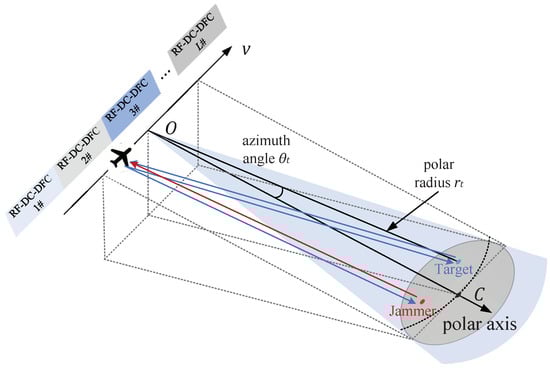 The jammer located in the imaging region intercepts the radar signal and forwards it according to different deception jamming strategies. Both the jamming signal and the radar echo will be received by the airborne radar. Coherent jamming strategies such as deception and shift-frequency jamming will obtain a certain accumulation gain in two-dimensional imaging processing. The jammer can achieve two-dimensional multiple false targets or small-area mask by relatively low jamming power. However, due to the inherent processing delay of the jammer, it is safe to assume that the interfering signals are not superimposed on the echo of the current pulse. Considering that the RSF-DC-DFC waveform applied different frequency coding and random frequency modulation between pulses, SAR imaging based on this agile waveform is a very effective ECCM strategy. In this scenario, a total of L RSF-DC-DFC waveforms are sequentially transmitted during the APC motion.