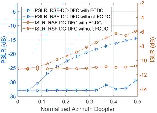 First, simulations are performed in a noiseless setup to observe the improvement effect of the algorithm embedding FCDC on the RSF-DC-DFC SAR imaging. We start from analysis of the radius profile for a target with different normalized coarse Doppler from 0 to 0.5 and a constant Center slant range. The normalized azimuth Doppler here corresponds to the azimuth angle with this configuration. Considering that the azimuth Doppler mainly affects the frequency synthesis performance, Figure 9 shows the variation of PSLR and ISLR on the radius profile when the normalized azimuth Doppler changes.