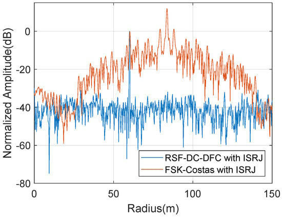 It can be seen from Figure 10b that, since the ISRJ interference can act on the current pulse of FSK-Costas, the wideband pulse is sampled and forwarded at subsection intervals. Hence the interference with strong coherence can form multi-point interference in the radius dimension. The maximum interference is about 12 dB higher than the true target. ISRJ can induce similar jamming effects on the other wideband waveforms. While RSF-DC-DFC can utilize the time segment and frequency diversity between the pulses to combat ISRJ. From the results in Figure 10d, it can be seen that the interference has little effect on the RSF-DC-DFC SAR image. Figure 11 is the radius slice comparison of Figure 10a,b.