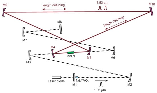 - Meng, X.; Diels, J.C.; Kuehlke, D.; Batchko, R.; Byer, R. Bidirectional, synchronously pumped, ring optical parametric oscillator. Opt. Lett. 2001, 26, 265–267. [Google Scholar] [CrossRef]