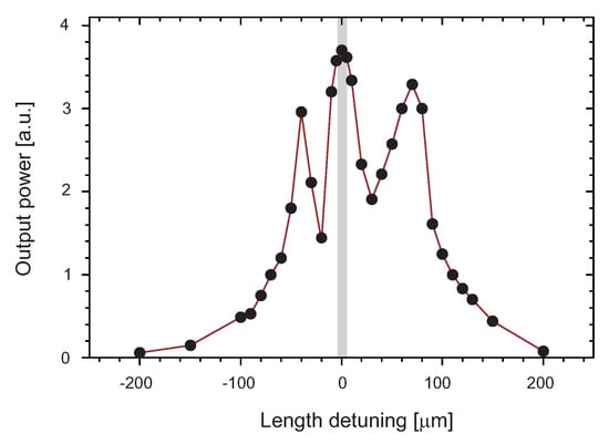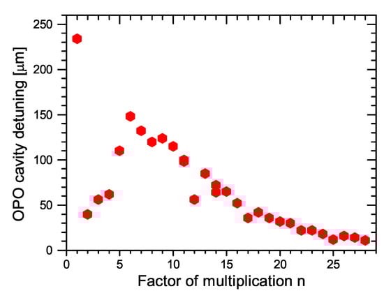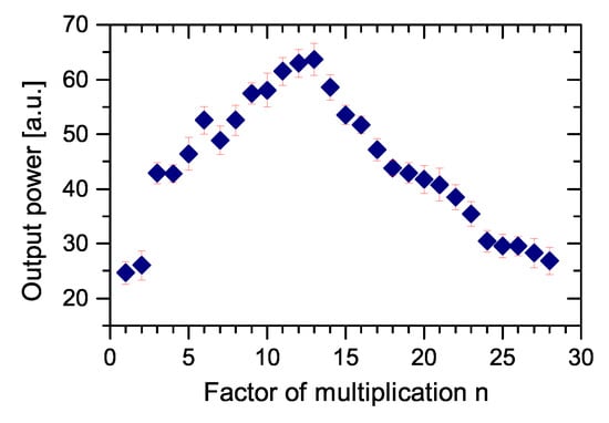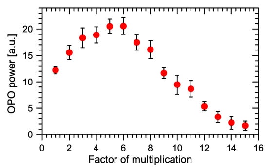 Dependence of the OPO output power behind mirror M10 on the factor of multiplication n is shown in Figure 15 and the dependence of OPO resonator length detuning still enabling the OPO generation on a factor of multiplication n is presented in Figure 16. It can be seen that, for higher n, the tolerance is smaller and the setting must be more accurate. In this case, only small fluctuations of the OPO signal were present and the modulation of the pump pulse amplitude was negligible. The OPO signal behind mirror M10 was detected simultaneously in both directions, confirming the bidirectional operation of the OPO. The possible detuning allowing parametric generation was significantly shorter than for . This could be caused by higher effective losses of the OPO cavity.