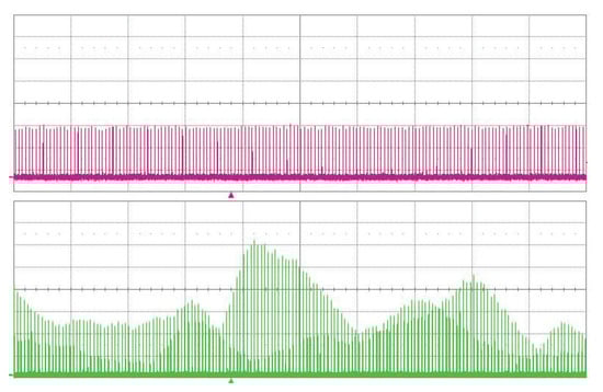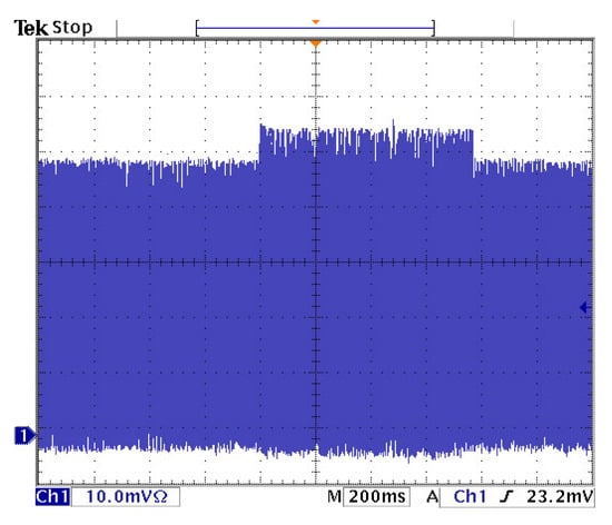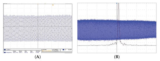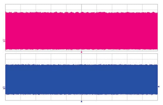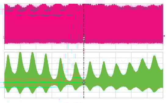 The long-term stability of the OPO signal was measured behind the mirror M9 by EOT photodetector ET-3500 (Coherent, Inc., Santa Clara CA, USA, rise time ps) connected to the LeCroy oscilloscope SDA9000 (Teledyne LeCroy, Inc., Chestnut Ridge NY, USA, analog bandwidth 9 GHz, sampling rate 40 GS/s). A weak modulation of the pulse train can be seen in both traces— Figure 5. With careful alignment, both single and double-pulse regimes of the OPO were obtained. In the double-pulse regime, for each pump pulse, a pair of signal wave pulses were generated, as can be seen in Figure 6. This confirms the two-way generation of parametric radiation. The signal pulses were generated when the pump pulse went back and forth through the PPLN crystal after the reflection from the saturable absorber (M8). The distance between the two pulses is given by twice the difference in optical distances between mirror M8 and PPLN and PPLN and mirror M11. In this case, the observed pulse delay is 1.5 ns.