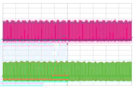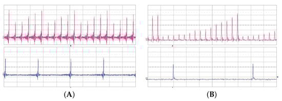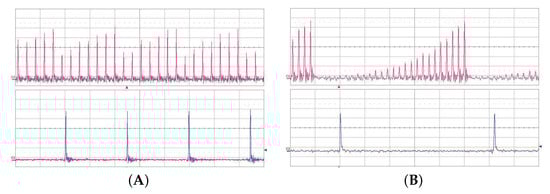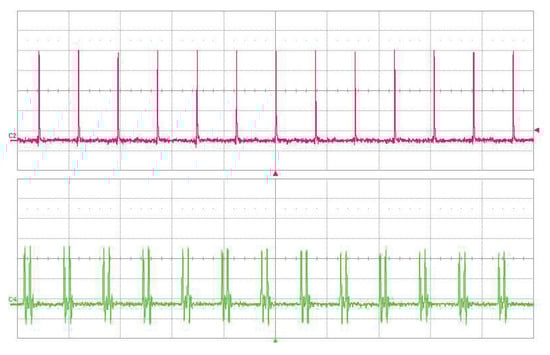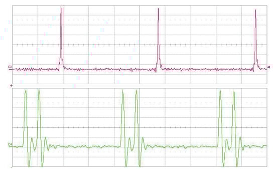 Analogous to the linear OPO cavity arrangement, the goal for a ring cavity was also to achieve a generation of double pulses circulating inside the cavity. In the case of the ring cavity, the OPO should be twice the length of the pump cavity. We observed that the possible OPO cavity length detuning (compared to the length of the pump laser) in the vicinity of enabling parametric oscillations has to be smaller than 100 m. In this configuration, we also achieved the dual-pulse OPO. The signal was measured behind mirror M10. In the direction from mirror M9, the signal corresponds to the pulses propagating in the counterclockwise direction; from mirror M5, the signal corresponds to the clockwise direction. In the double-pulse regime, for each pump pulse, a pair of signal wave pulses were generated as can be seen in Figure 8. This confirms two-way generation of parametric radiation.