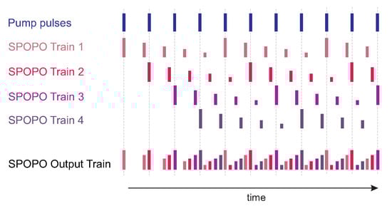The principle is as follows: In the synchronously pumped OPO, the length of the linear OPO cavity should be equal to the length of the pump cavity . With equal lengths, the repetition rate of both lasers is equal and each pump pulse corresponds to the one in the OPO. When the OPO cavity is shorter and the difference between the mutual resonators lengths where n is an integer, the synchronous pumping occurs after n round trips of the OPO cavity that corresponds to round trips of the pump resonator. The repetition rate of the OPO will be n-times higher than that of the pump [31]. The principle of the pulse multiplication is explained graphically in Figure 10. Because there is no gain for the signal pulse inside the PPLN crystal without simultaneous co-propagation with the pump pulse, a successive gradual decrease in the OPO pulse amplitude will occur until the next pump pulse arrives and provides energy. The increase in signal pulse amplitudes between two pumping pulses observed on oscillograms was given by the fact that the length of the OPO was shorter than the pump cavity, and the pulses remained longer in the OPO cavity after the amplification.