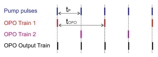 The method to overcome some of these limitations, at least for the linear OPO configuration, was demonstrated for extracavity pumping by A. Velten [36]. In this article, quasi-synchronous pumping of the OPO by an external Ti:Sapphire laser is described; the repetition rate of the pumping pulses was twice the repetition rate of the OPO cavity. We adopted this technique for the intracavity quasi-synchronously pumped linear OPO. The system is based on the PPLN parametric oscillator and is pumped by the diode-pumped Nd:YVO laser. In principle, it is a divide-by-2 subharmonic OPO. The graphical representation of divide-by-2 OPO trains is shown in Figure 17.