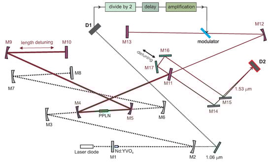 The arrangement was based on the previous linear setup (see Figure 1). In this case, the optical length of the pump cavity was set to be half of the OPO cavity length. The OPO cavity mirrors were adjusted to ensure the parametric oscillation only for pump pulses coming from the direction of the Nd:YVO crystal. This arrangement ensures stable, long-term OPO and pump laser generation without any fluctuations. In this setup, the OPO generates signal pulses with the same repetition frequency as the pump laser, but the signal consists of two completely independent pulse trains. The repetition rate of each of the two pulse trains was the half of the pump, in this particular case it was 41.1 MHz. The relative phase of these two combs was not constant because each train was built up independently from random noise [32,33,37], so such pair of independent combs is suitable for intracavity interferometry.