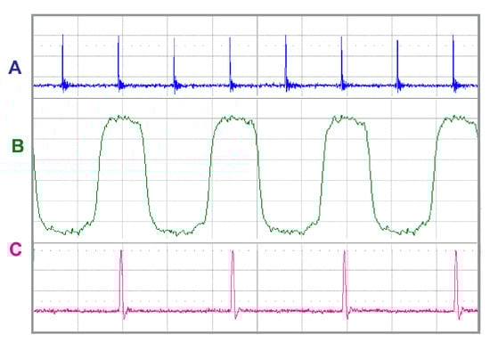 A—Train of pump laser pulses, repetition rate = 82.2 MHz. B—modulating pulses with repetition rate , signal is derived from the pump laser pulses, C—Train of OPO pulses after the division by two and appropriate delay, repetition rate = 41.1 MHz.