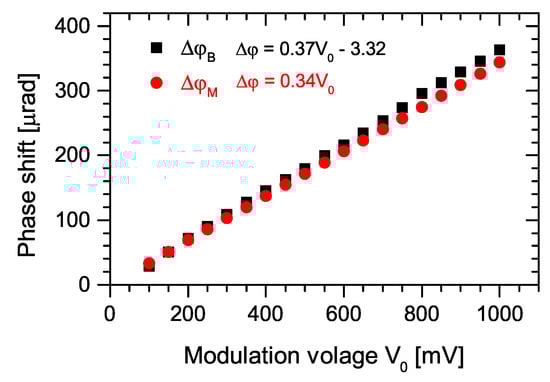where is the extraordinary index of refraction, electro-optic coefficient, d distance between electrodes, and l is the length of the crystal in the direction of laser beam propagation. For the calculations of , we used the following LiNbO material parameters: at 1.5 m and m/V [40]. In the ideal case, the slope of both phase shift difference ( and ) dependencies on EOM modulation voltage should be identical. The observed slight difference could be caused by the nonhomogenous electric field inside the laboratory-built electrooptic modulator or inaccurately determined material parameters of lithium niobate. Nevertheless, this difference can be stated as a good agreement between the measured and the theoretical value of the phase shift difference. This arrangement can be used to measure the frequency dependence of nonlinearities.