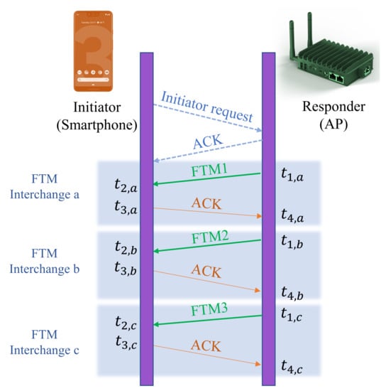 where k is the identity of the interchange in the burst (illustrated by in the figure), is the receiving time of ACK, is the transmission time of the FTM message, and is the processing time in the smartphone, as illustrated in Figure 1. Several FTM–ACK interchanges occur in one burst. The RTT calculation continues for all the FTM–ACK processes in the burst. Finally, the average value is considered for RTT calculation. Parameters such as the burst duration and the number of bursts are defined during the negotiation phase between the AP and User Equipment (UE) [21].