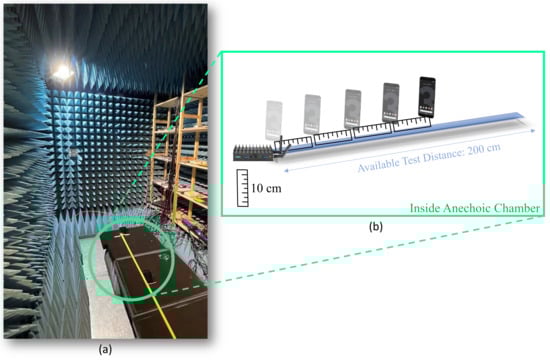 The anechoic chamber we use has a size of and is constructed using the Rainford EMC Systems modular panel system. This consists of -thick panels formed from two ‘skins’ of -thick galvanized steel laminated over a core made of wooden material. The whole chamber, including the sidewalls and the ceiling, is covered with -thick, solid, sharp-tip resistive pyramidal foam absorbers (Figure 3a).