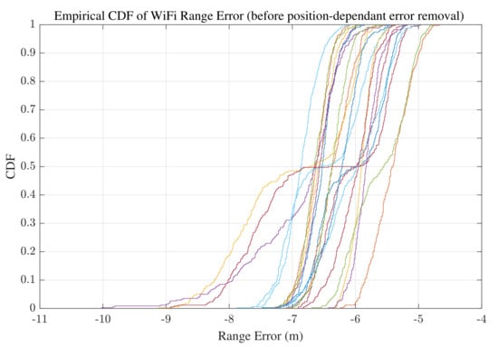 CDF of range errors for the measurements collected in the real environment using the WiFi device.