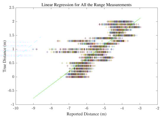 As illustrated in Figure 3b, the smartphone is placed at different distances from the WiFi device in intervals. The training data are the range measurements collected at different distances, and the labels are the true distances between the mobile phone and the WiFi device. Regarding the known labels, this problem requires a supervised learning method. There are 21 labels and 300 collected ranges at each point. Before applying any range calibration, the error in range measurements in the anechoic chamber is calculated and the Cummulative Distribution Function (CDF) of the mean error at 21 points is illustrated in Figure 4. First, the linear regression method is applied to all the collected data, and the result is illustrated in Figure 5. Linear regression is a supervised ML algorithm frequently addressed in the fundamentals of ML [49,50]. In the linear regression training phase, a data set is used to estimate the model by finding the offset and scale parameter of a line. Then, in the test phase, the new input is provided to the model, and the output is estimated. The linear regression is also applied to the mean value of the collected ranges at each point in the chamber. The resulting regression line is shown in Figure 6.