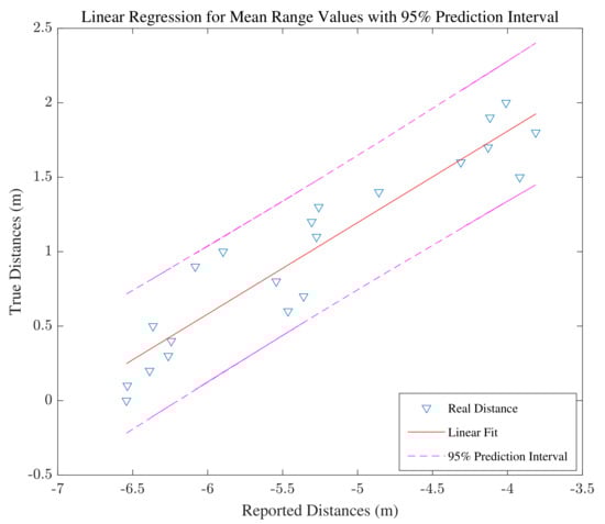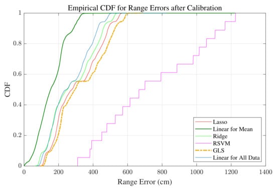 To find the most efficient model, we apply the different models to correct the RTT measurements in the real test environment. The CDF of the range errors after range correction are illustrated in Figure 7. Based on the findings, the most accurate results are achieved by using the linear regression model made with mean values. Because of highly correlated measurements, it is justifiable that linear regression with averaged values has better accuracy compared to regression with all data [54]. Therefore, the model utilized for the next phases is the model obtained from linear regression with average values. The offset for the estimated model is , and the scale parameter is .