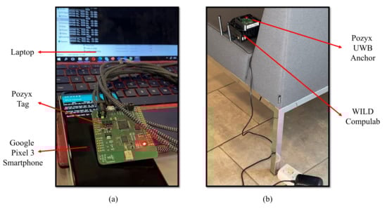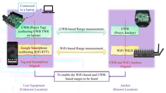 In this phase, the range values are collected by the UE from both the WiFi devices based on RTT and the UWB devices based on TWR measurements. The measurements in this phase are different from those taken in the previous phase. The previous phase is completed once in the indoor environment of research interest. All three devices are used to enable the trilateration method to locate the UE. The UE and one anchor are illustrated in Figure 8.