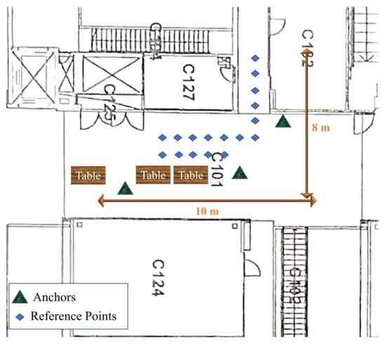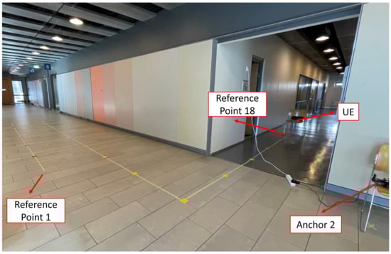 Static positioning is widely utilized to evaluate the enhancement of range measurements [23,24,25,32,42]. We evaluate our work by positioning using trilateration of reference points. The test area is inside the department of Computer Science at the University of Helsinki. The reference points are marked with yellow signs, as illustrated in Figure 9. The yellow marks are located using a measurement tape which has an accuracy of one millimeter. However, the accuracy of placement of the devices is one centimeter, considering the placement of the antenna chip inside the mobile phone and the UWB and WiFi devices. In addition, the floor plan of the area for the measurement is illustrated in Figure 10. There are three anchors placed in the hall, and the UE moves on the reference points inside the hall and the corridor. One of the anchors and the UE are shown in Figure 11.