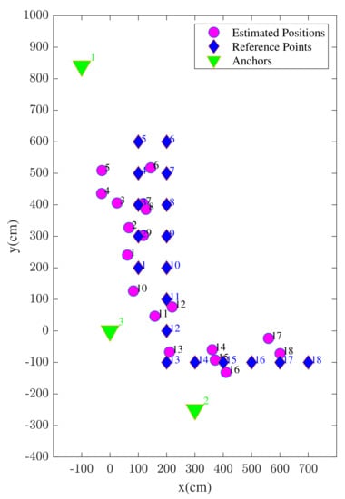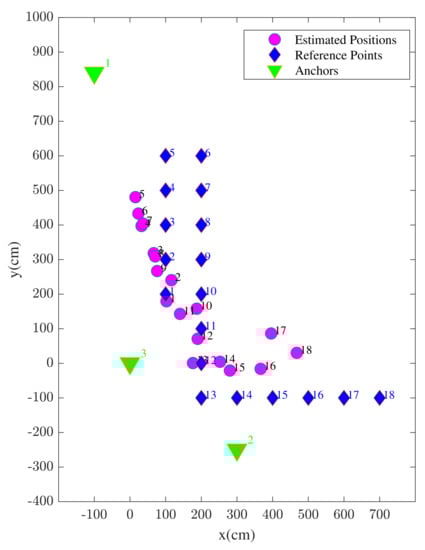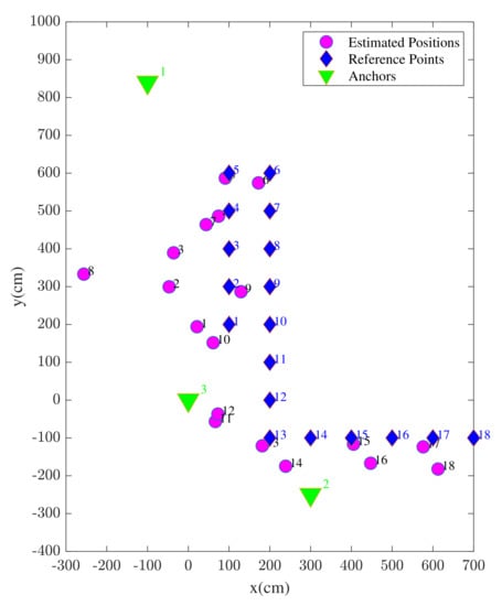 Moreover, , , and are the known positions of the three anchors, and and are the range measurements from the user to the three anchors.