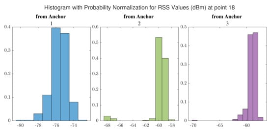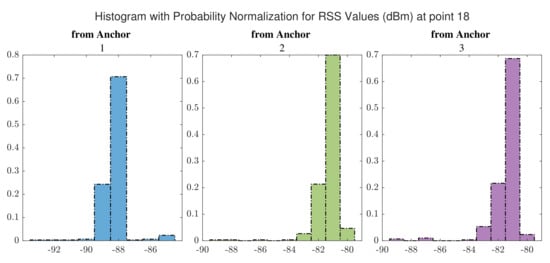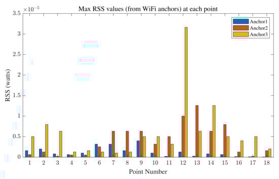 The maximum RSS values are utilized in the proposed range fusion algorithm. The corresponding values received from WiFi devices in one epoch at all the reference points are shown in Figure 18, and those received from UWB anchors are shown in Figure 19. By comparing Figure 18 and Figure 19, it is observed that the RSS values for UWB signals are lower than those for WiFi signals as a result of regulations on UWB that require it to have lower power gain. Furthermore, the maximum RSS values at points inside the corridor in the test area (mainly points ) display the smallest RSS values from the anchors. It is also observed that the RSS values for points inside the corridor are the smallest for those signals being received from anchor 1, which is the farthest anchor.