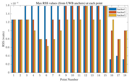 Maximum RSS values in one epoch at each reference point for signals received from three UWB anchors.