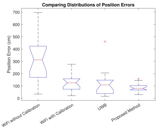 To evaluate and analyze the results numerically, the positioning errors when using calibrated and non-calibrated WiFi devices, UWB devices, and the proposed method are illustrated using box plots in Figure 21. In the notched box plots in Figure 21, the red lines represent the median value, the length of the dashed lines represents the whiskers, the gray horizontal upper line is the non-outlier maximum, the lower one is the non-outlier minimum, the upper end of the box is the 75th percentile, the lower end of the box is the 25th percentile, the notch represents the confidence interval of the median, and the red plus signs show the outliers. The box plots are not influenced by outliers and visualize the distribution of data in a stable way. The proposed method has the lowest median in Figure 21 and the least variance in comparison with other methods. WiFi with calibration also outperforms WiFi without calibration to a good extent. The results show that the proposed error correction approach is able to considerably improve positioning accuracy.