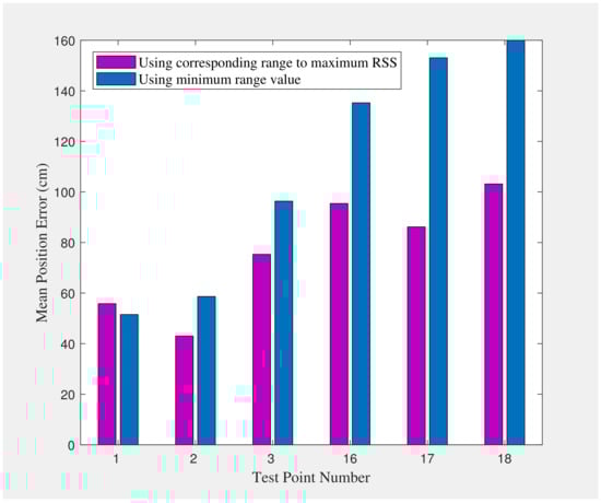 We can observe that the NLOS points have higher error values in their position estimates than the LOS points, which shows the impact of NLOS conditions on positioning accuracy. We can also observe that LOS points have higher RSS values than NLOS points, as illustrated in Figure 18 and Figure 19. These figures, together with Figure 22, show how RSS values affect positioning accuracy and demonstrate our motivation for considering RSS values in the proposed fusion method. The proposed method outperforms using minimum range values. It is observable that the proposed method provides a consistent solution, and the results do not vary highly (which results in minimum variance, as listed in Table 4 and shown in Figure 21).