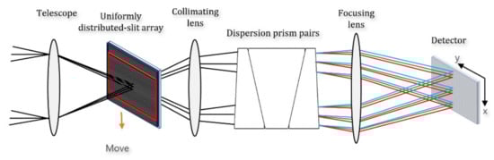 Figure 1 shows a schematic of a UDACSI system, with a periodic uniformly distributed-slit array template of incident light entering the system and at the telescope’s image focal plane position, implementing spatial modulation, splitting the light by a prism, and projecting it through the lens onto the detector. A schematic diagram of the UDA at the middle of the aperture diaphragm and the upper and lower sides is shown. Spectral dispersion occurs in the x-axis direction; the slit array moves with the micro-displacement motor in the x-direction, and dispersion is not involved in the y-direction.