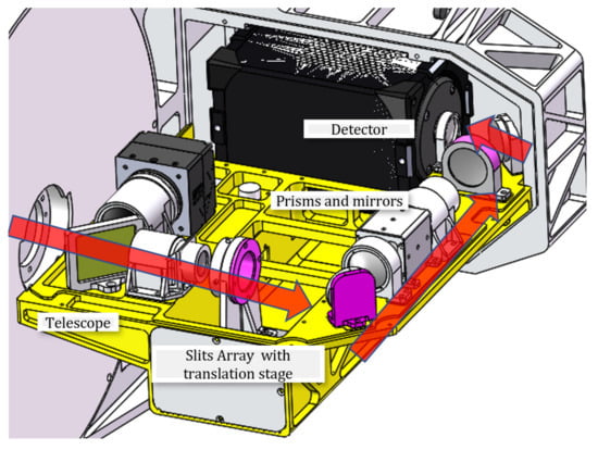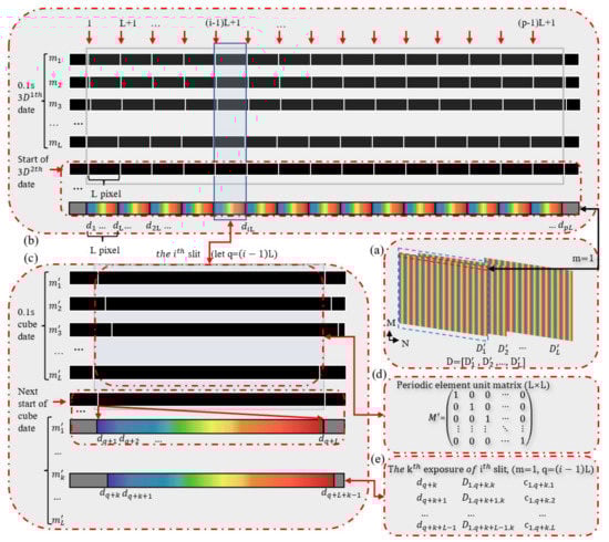 The slit array moves with the micro-displacement table, and the prism pair projects the space and spectrum of the spectral data cube, where the light of the surface field of view is located in different locations on the detector according to the principle of spatial wavelength spectroscopy. This movement process is measured L times to obtain spatial spectral data of the distribution of the detector, as shown in Figure 2a. We studied the dispersion dimension, taking m = 1; in Figure 2b, it can be seen that the slit of P cycle distribution in the effective field of view is simultaneously obtained in the detector spectroscopy. Our design takes into account the detector response to the wavelength, so that the spectral range of interest on the detector surface element does not produce spectral aliasing between each other. We used a micro-displacement stepper motor to control the slit array to move a pixel distance while measuring an exposure, and the movement of the slit and the data acquisition of the detector are matched. Spectral data acquisition corresponding to the spatial location of interest is completed through each slit via L exposures. We analyzed the data flow variation of a single slit over the measurement cycle, as shown in Figure 2c. We divided the slits in the effective field of view into P cycles, with a single cycle length of L, and analyzed the changes in the range of the  slit ((i − 1) L + 1, iL). The initial position sequence of the slit is 1, and with the slit array moving, the slit position sequence adds 1 in turn until the slit is at the last sequence in the range. A single slit change generated by a single slit change of the 3D data is shown in Figure 2d. With the  (k = 1, 2, …, L) second exposure, the slit position sequence is k, and the distribution of the spectroscopic elements on the detector is shown in Figure 2e.