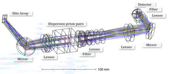 The conventional single slit prism dispersion spectrometer adopts the method of single prism dispersion, and the beam of light emitted from the center and edge of the conventional slit passes through different sections of the prism, while the dispersion rate changes with the change in the top angle of the prism and the spectral dimension forms distortions. To a certain extent, this change leads to a decrease in the accuracy of the system’s spectral calibration, which makes it difficult to process and apply the imaging spectral data. Due to the characteristics of the prism dispersion itself, a single prism spectroscope has the phenomenon of spectral line bending, and in order to reduce the degree of monoprism dispersion bending, a dispersion prism pair can be used. The system samples symmetrical single prism design dispersion prism pairs and simulates our optical system using Zemax (optical design simulation software), as shown in Figure 3.