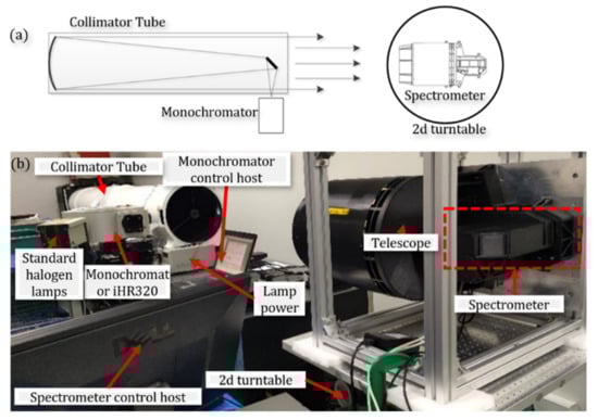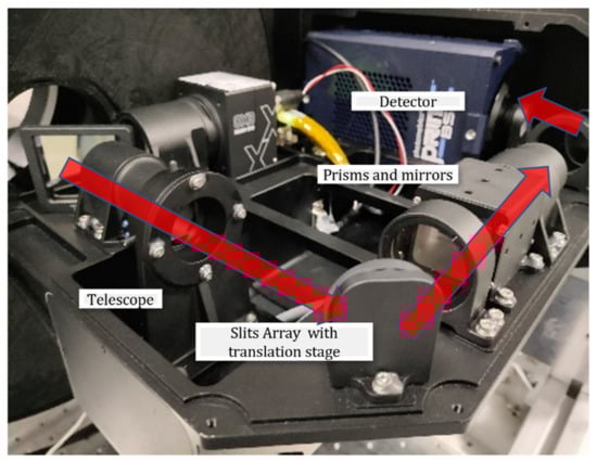 Our imaging spectroscopy system is mainly composed of a forward telescopic system, a uniformly distributed-slit array, a prism pair spectroscopic structure, and a complementary metal-oxide-semiconductor (CMOS) detector. We designed and assembled a uniformly distributed-slit array that can move with the micro-displacement motor, dividing the image surface covered by the detector into 15 dispersion cycles, ranging from 450 to 900 nm (visible and near-infrared). Theoretically, each dispersion cycle can achieve 35 (detector 1024 × 1024 pixels at a dual-cell merger) or 70 (detector 2048 × 2048 pixels) spectral channels. During the calibration phase, there is one-to-one periodic mapping between the pixel-level slits of the slit array and the pixels on the sensor. The spectral calibration of our system uses a monochromator (model iHR320) from a tungsten halide light source.