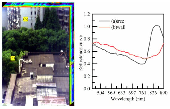 The reconstruction of the external imaging resulted in a monochromatic image in the order of spatial position to obtain a monochromatic light image of 35 bands, as shown in Figure 8. This reconstruction clearly distinguished the spatial information of the target scene, and the spectral information of the (a) tree and (b) wall position was obtained, as shown in Figure 8, as was the spectral information of the two spatial positions and the corresponding different wavelength reflectance of the corresponding spatial positions.