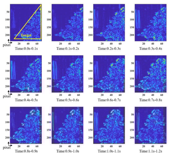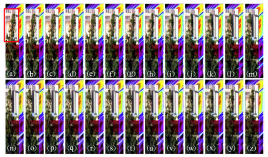 Figure 9 shows the successive movements of a target dynamic tree as it swings in the scene: (a) to (m) the crown of the tree can be seen swinging to the left, (n) to (z) the crown of the tree can be seen swinging to the right. The main low-brightness dynamic trees, low-brightness walls, and high-brightness glass windows in Figure 9 can be clearly seen. Those may limit the dynamic trees that can distinguish small movements with the naked eye. We also analyzed the movement of the crown of the tree in the red box in Figure 9.