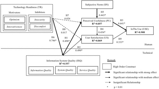 Without ignoring the basic structure of the D&M IS success model, this research interpreted NB as system use and replaced the intention to use with PU, which is closely related to the TAM model. In TAM, perceived ease of use (PEOU) is conceptualised as an antecedent of PU, whereas PEOU and PU significantly influence user attitudes towards using technology. PEOU in TAM is somewhat related to IoT system quality (specifically refer to the ease-of-use characteristic for system quality (SQ) in the current research model). In TAM, PEOU is hypothesised to have direct impacts on intentions to use via PU. Meanwhile, in the present research model, ISQ was hypothesised to have positive effects on PU and indirect positive effects on IoTbs Use.