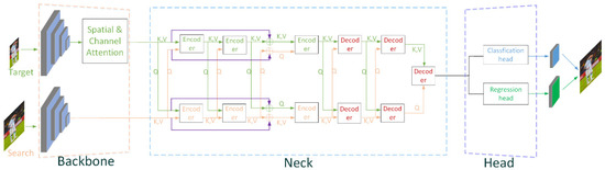 - The main task of the encoder is to carry out global information interaction between features obtained from the backbone, and it is the key to solve the problem of the tracking process being susceptible to similar target interference. The decoder is responsible for decoding the information already fused in the encoder and sending it to the head module, therefore, the decoder is also essential.