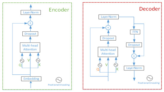 The decoder has one Feed-Forward network and LN layer more than the encoder; assume that the inputs of the decoder are , , ; the variables of , , after multi-head attention are referred to as . Similar to the encoder, can be obtained as follows: